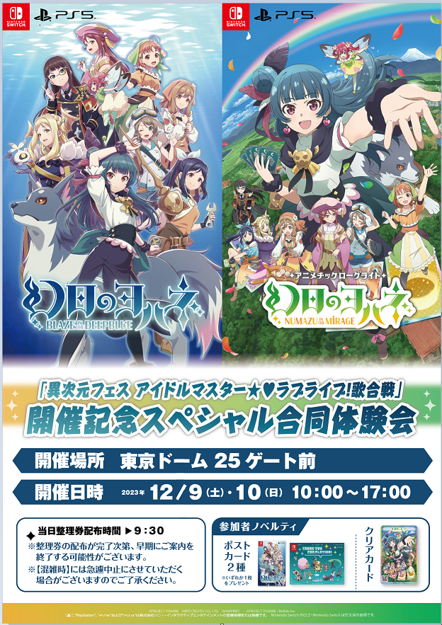 「ラブライブ!サンシャイン!!」公式スピンオフ作品「幻日のヨハネ -SUNSHINE in the MIRROR-」のゲーム2タイトル、「幻日のヨハネ -BLAZE in the DEEPBLUE-」・「幻日のヨハネ -NUMAZU in the MIRAGE-」を試遊いただけます。