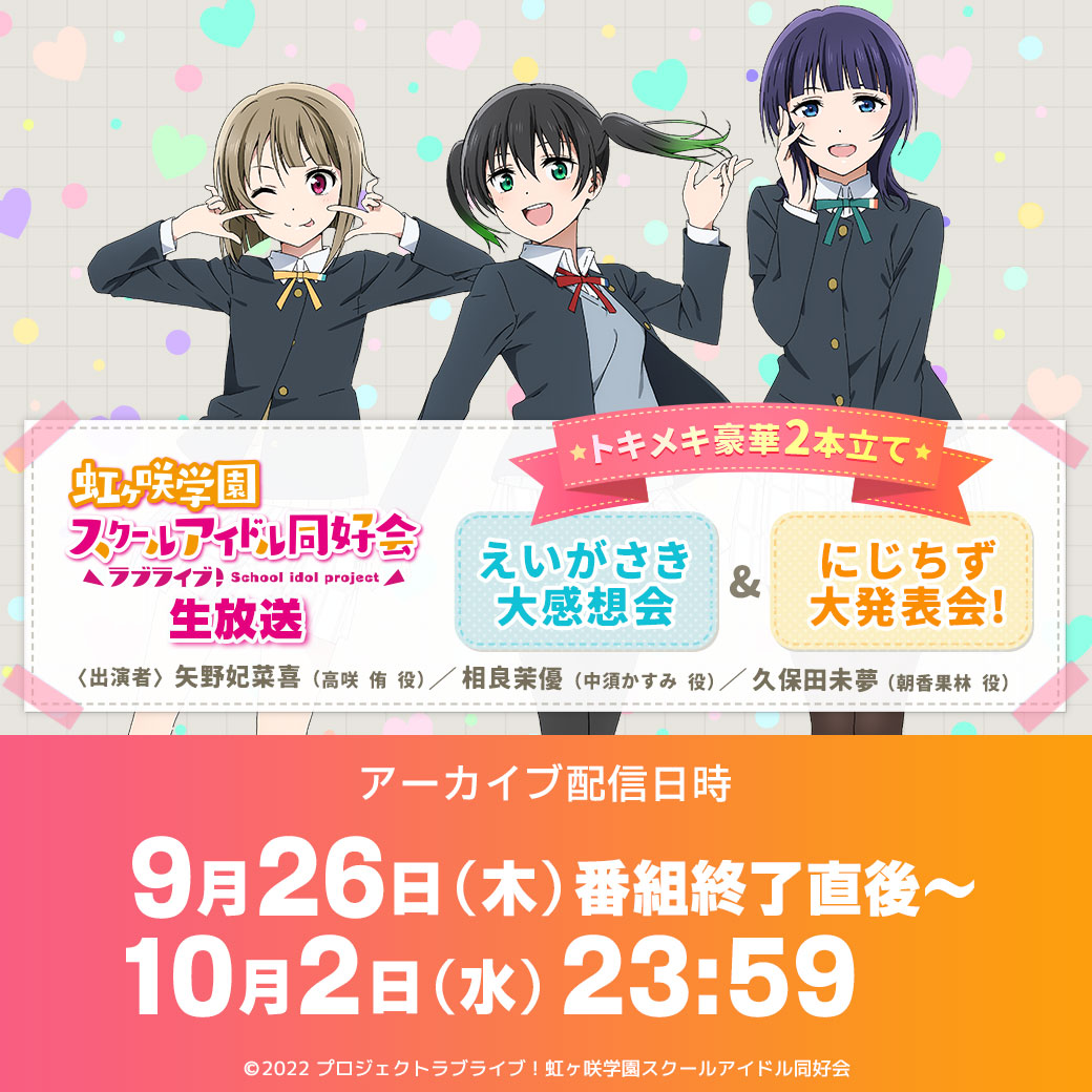 「ラブライブ!虹ヶ咲学園スクールアイドル同好会生放送トキメキ豪華2本立て!えいがさき大感想会&にじちず大発表会!」アーカイブのお知らせ!