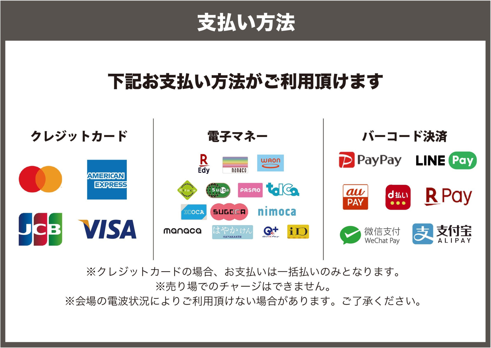 ※会場でのチャージ・充電はできません。事前に残高のご確認・チャージ等をお願いいたします。