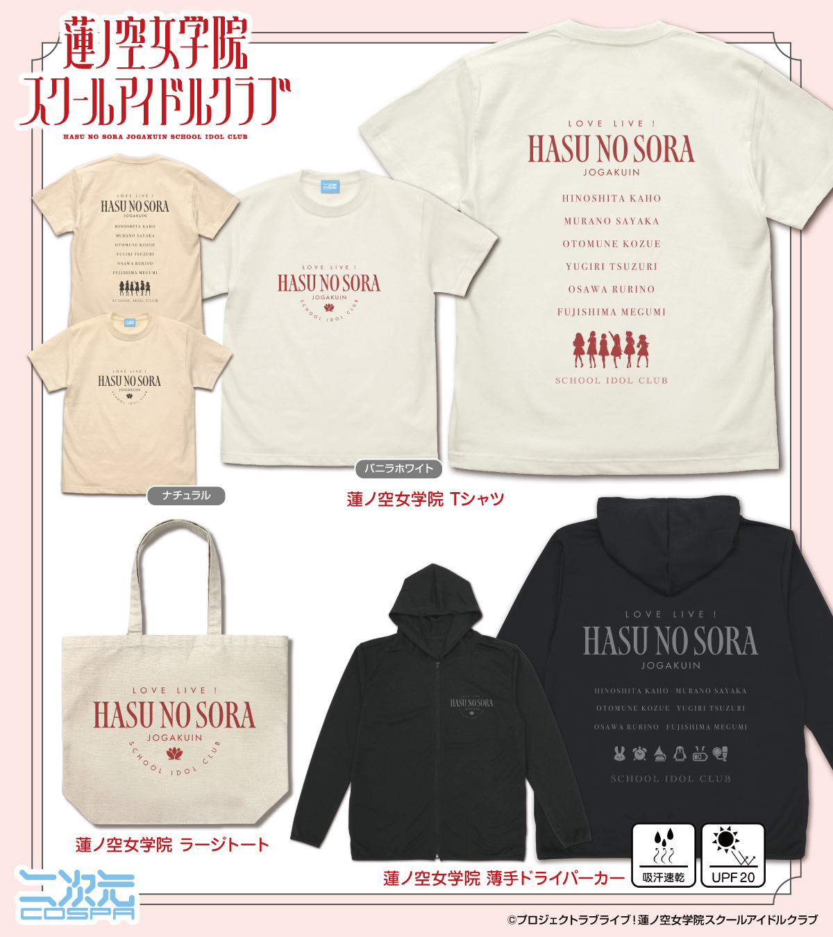 さらに、伝統的な蓮ノ空のイメージに合わせたロイヤルなデザインが日常の中にも溶け込みやすい「Tシャツ」「ラージトート」「薄手ドライパーカー」もラインナップ
