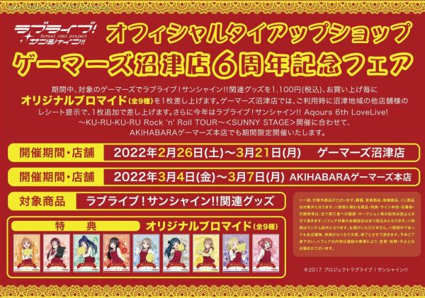 6周年を記念いたしまして、下記期間中、対象のゲーマーズ店舗でラブライブ!サンシャイン!!関連グッズ商品(書籍、CD,映像商品を除く)を1,100円(税込)ご購入毎に1枚、ラブライブ!サンシャイン!! ゲーマーズ沼津店5周年描き下ろしイラスト使用したブロマイド(全9種)を差し上げます。沼津店では、沼津地域の他店舗様のレシートをお持ちいただけますと1枚プラスして差し上げます。